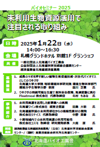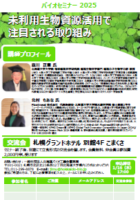 今年度は「バイオセミナー2025」と銘打って、公益財団法人北海道科学技術総合振興センター、経済産業省北海道経済産業局と共催で未利用生物資源活用で注目される取り組みについての講演会を開催する運びとなりました。